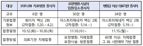 또한 코로나19 치료병원 종사자와 요양병원·시설의 입원·입소·종사자 및 병원급 이상 의료기관 종사자는 상반기 접종 시행방식과 유사하게 의료기관 자체접종 및 방문접종을 통해 접종받는데, 사전 조사로 희망자 수요 파악 후 필요한 백신 물량을 배송한다.