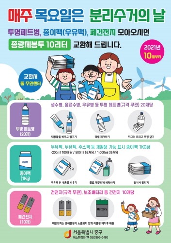 서울 중구는 10월부터 재활용이 가능한 투명 페트병·종이팩·폐건전지를 쓰레기 종량제봉투로 교환해 준다고 밝혔다.