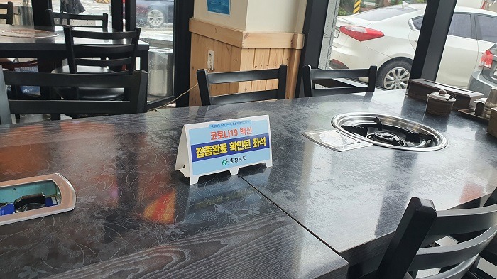 충청북도는 29일 코로나19 백신접종 완료자 구분을 위해 “코로나19 백신접종완료 확인된 좌석”테이블 안내 표시판을 제작하고 시군 및 협회 등을 통해 일반음식점 및 휴게음식점 등에 배부했다.