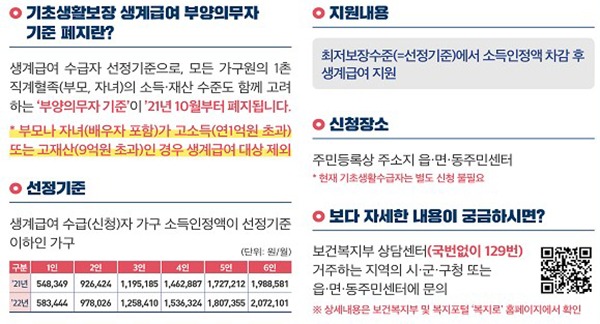 보건복지부는 올해 2차 추경 과정을 통해 국회의 동의를 얻어 당초보다 앞당겨 오는 10월에 생계급여 부양의무자 기준을 폐지한다고 설명했다.