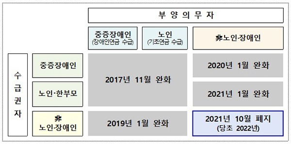이에 앞서 복지부는 2017년 11월부터 매년 생계급여 부양의무자 기준을 단계적으로 완화해왔다. 이번 폐지로 올해 연말까지 저소득 취약계층 40만 명이 새롭게 생계급여 수급자로 책정될 것으로 보인다.