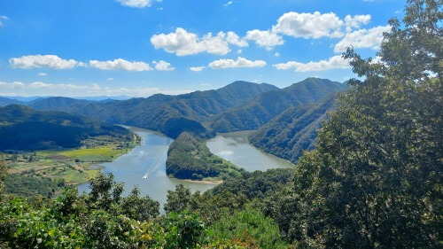 청명한 가을 하늘과 굽이치는 금강이 어울리는 명소! 충북 옥천의 가장 작은 행정구역 안남면에 우뚝 솟아있는 둔주봉(384m) 7부 능선쯤 전망대에 오르면 휘감아 도는 금강 줄기가 만들어 낸 한반도 지형에 감탄이 절로 나온다.