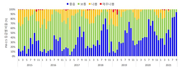 또한 36㎍/㎥ 이상인 나쁨이상 일수도 2018년 이후 9월에는 지속적으로 나쁨이상 농도 수준이 발생하지 않아 0일을 기록했고, 시간농도를 기준으로 9월의 좋음 발생빈도는 2016년 대비 3.8배 증가한 94%였다.