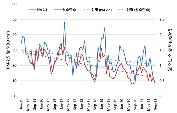 이와 함께 계절풍에 따라 국외 영향이 적고 국내 영향이 지배적인 8~9월의 초미세먼지 농도가 2015년 이래 최저수준 농도를 보이면서 국내 미세먼지의 기저농도가 지속적으로 낮아지는 것을 확인할 수 있었다.