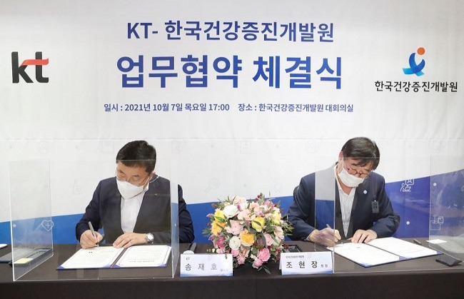KT가 한국건강증진개발원과 서울 중구 한국건강증진개발원 사옥에서 ‘디지털 헬스케어 환경 조성을 위한 업무협약’을 체결했다고 8일 밝혔다.