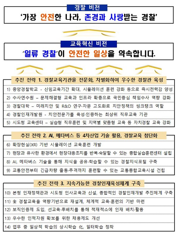 또한 시뮬레이션훈련 시스템을 구축하는 등 경찰교육을 첨단화하고, 종합적 인재개발·관리 체계를 만들며 보직인증제와 선교육·후배치를 도입해 동기부여와 전문성을 강화하기로 했다.