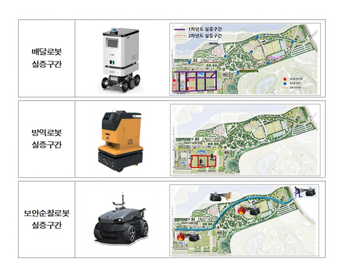 실증 분야는 ▲배달 로봇 ▲코로나19 방역 로봇 ▲보안순찰 로봇으로, 개별 해당 기업·기관은 규제특례를 적용 받아 세종중앙공원에서 자율주행기술 고도화, 안전성 및 상용화를 중점 검증한다.