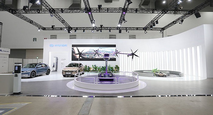 현대자동차는 미래 모빌리티 기술력을 보여주는 UAM(Urban Air Mobility) 1:3 축소형 모델과 대표 친환경차 모델인 아이오닉 5, 넥쏘 등으로 전시 공간을 구성했다.