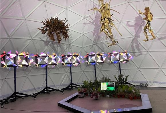 전시 주제는 ‘기후 위기를 경고하기 위해 미래에서 온 메시지’다. 전시 작품은 ▲빛과 소리로 감정을 표현한 미디어 아티스트 그룹 디지털 세로토닌의 ‘Knospe III’ ▲미디어 아티스트로 유명한 김창겸 작가의 작품에 홀로그램을 접목한 ‘찰나’ ▲식물과 기계와의 결합 및 진화를 표현한 소수빈 작가의 ‘신-생태계의 휴리스틱’ ▲키네틱 아트(움직이거나 움직이는 부분이 포함된 예술작품)를 주로 선보이는 정동암 작가의 ‘노마드-스페이스W’ ▲미래의 인류에게 남기는 지구의 모습을 표현한 김준명 작가의 ‘인피니트 네이쳐’ 등 총 5개로 구성됐다.