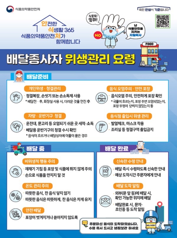 배달종사자는 배달용 운반기구 등의 청결상태를 수시로 확인하고 세척·소독해야 한다. 배달음식이 안전하게 포장됐는지 확인해 음식이 오염되지 않게 주의해야 하고, 따뜻한 음식과 차가운 음식은 서로 닿지 않게 구분해서 담아야 한다.