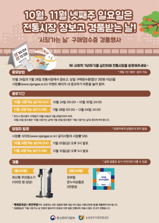 당일 전통시장에서 3만원 이상 구매한 고객들은 구매 영수증을 전통시장 이벤트 페이지(시장愛, www.sijangae.or.kr)를 통해 응모하면 추첨을 통해 매월 최신 무선 청소기(50명)와 모바일 온누리 상품권(5만원권, 50명)을 지급한다.