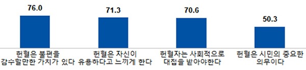 이 밖에도 헌혈은 불편을 감수할만한 가치가 있다가 76.0%, 헌혈은 자신이 유용하다고 느끼게 한다는 71.3%, 헌혈자는 사회적으로 대접을 받아야 한다고 생각한다도 70.6%였다.