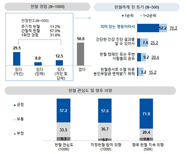 특히 헌혈에 참여한 동기로는 의미 있는 행동이라서는 답변이 70.2%로 가장 높았고, 이어 간단한 건강진단 결과를 알 수 있기 때문은 25.2%였다. 한편 헌혈경험자의 향후 헌혈 의향은 71.8%였다.