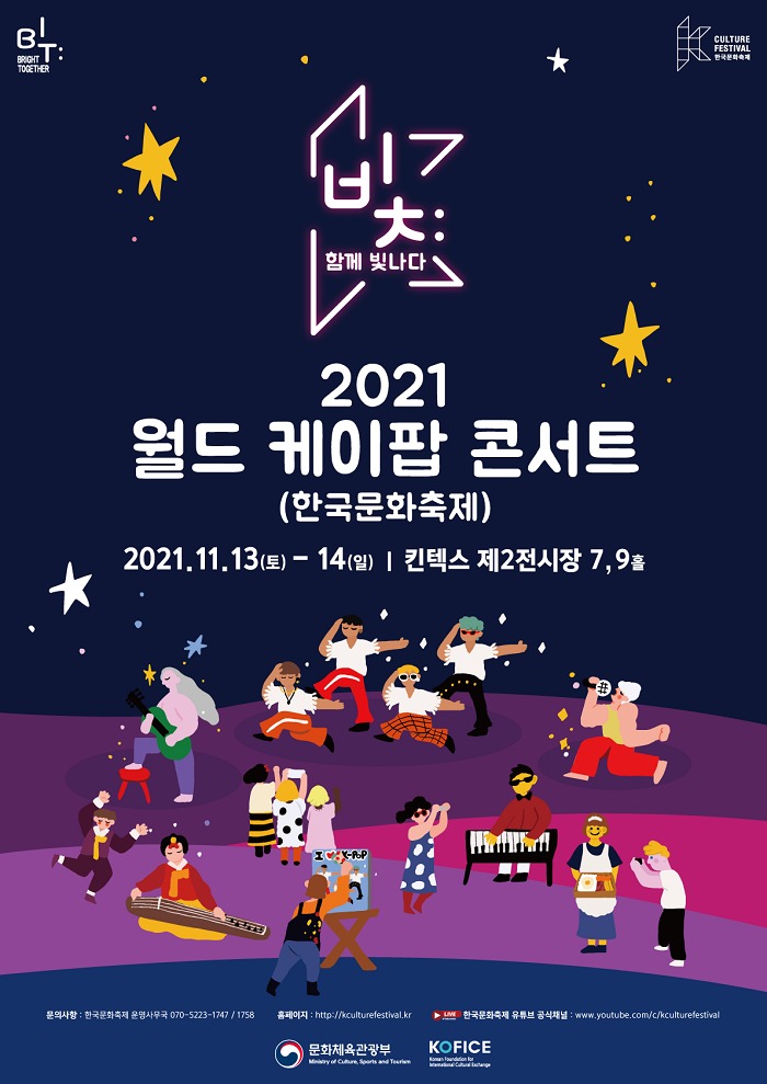 문화체육관광부(이하 문체부)는 코로나 장기화로 지친 전 세계한류 팬을 위로하고 새로운 희망의 메시지를 전달하기 위해 11월 13일(토)과 14일(일), 킨텍스(경기도 고양시)에서 ‘한국문화축제-2021 월드 케이팝콘서트’를 열고 ‘한국문화축제’ 유튜브 채널을 통해 온라인으로 생중계한다.