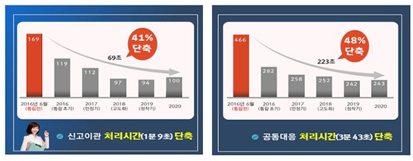 이 결과 다른 기관 소관의 신고 전화를 해당 기관에 전달하는 시간이 통합서비스 이전에는 기존 평균 2분 49초 걸렸으나 지난해에는 평균 1분 40초로 69초(41%)가 단축됐다.