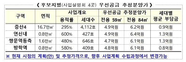 사업설명회를 마친 후보지 4곳의 경우 주민에게 현물보상으로 공급하는 주택가격은 전용 59㎡는 4억 8000만∼4억 9000만원, 전용 84㎡는 6억 1000만∼6억 4000만원으로 추정됐다.