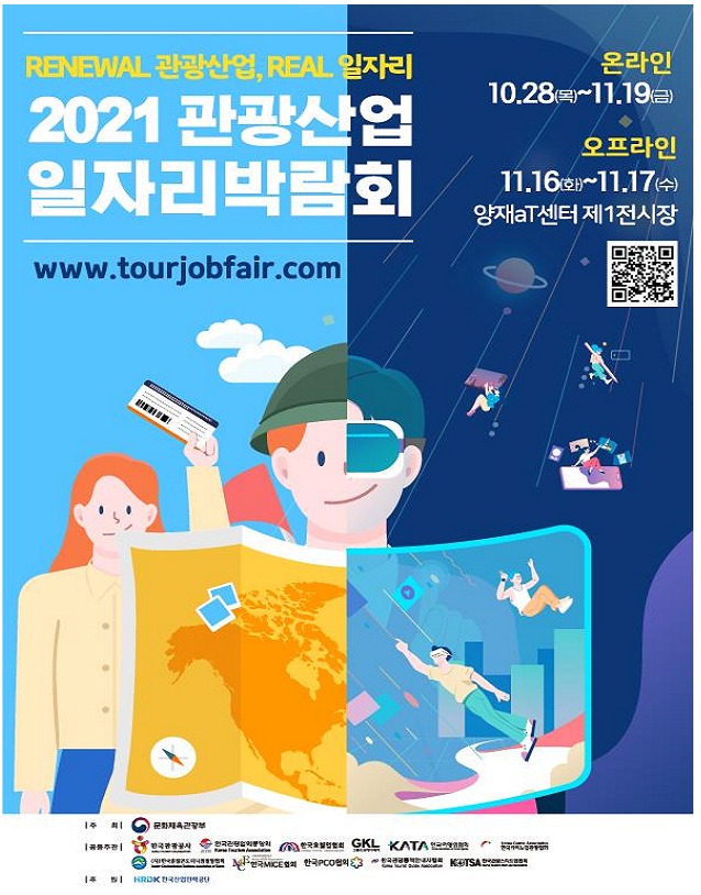 문화체육관광부는 한국관광공사와 한국호텔업협회, 한국관광협회중앙회 등 11개 관계 기관 등과 함께 28일부터 11월 19일까지 ‘리뉴얼(Renewal) 관광산업, 리얼(Real) 일자리 2021 관광산업 일자리 박람회’를 공식 누리집(www.tourjobfair.com)과 에이티(aT)센터(11월 16~17일)에서 온·오프라인으로 개최한다고 밝혔다.