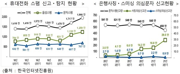 또한 코로나19로 비대면 사회가 도래함에 따라 휴대전화 불법스팸 신고·탐지량도 지난해 하반기 1717만 건에서 올해 상반기 1966만 건으로 15% 증가했다. 은행사칭 불법스팸도 올해 1분기 16만 건에서 2분기 29만 건으로 81% 급증하고 있다.