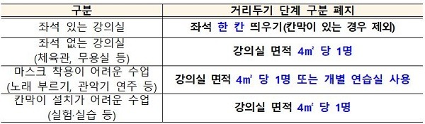 먼저, 기존 1~4단계 거리두기 구분은 폐지되며 모든 지역에서 ‘전면 등교 가능’으로 학교 밀집도 기준을 변경한다.