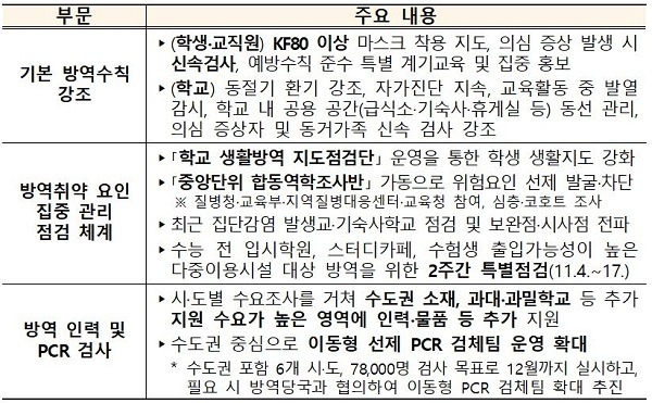 사회전반의 단계적 일상회복이 진행되면 예방접종 완료율이 상대적으로 낮은 학생들이 밀집한 학교의 방역관리는 더욱 중요해지는 상황이다. 11월 18일 예정된 대학수학능력을 위해서도 최대한 안전하게 일상회복을 준비할 필요가 제기된다.