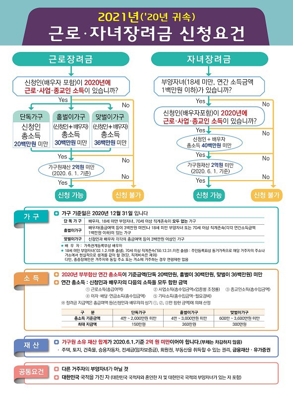 소득요건은 지난해 근로, 사업 또는 종교인 소득이 있고 부부 합산 연간 총소득이 기준금액 미만이어야 한다. 단독가구는 4만∼2000만원 미만, 홑벌이가구는 4만∼3000만원 미만, 맞벌이가구는 600만∼3600만원 미만이다.