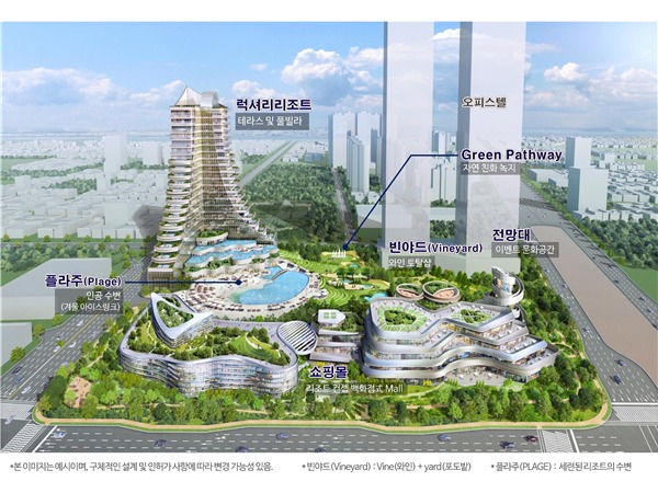 다음으로, 리조트는 머물고 싶은 ‘스테이케이션(Stay+Vacation)’을 지향하는 차별화된 공간으로 다양한 형태의 Pool과 테라스가 어우러지는 지상 21층 , 200여객실 규모의 도심속 휴양 럭셔리 리조트로 조성될 예정이다.