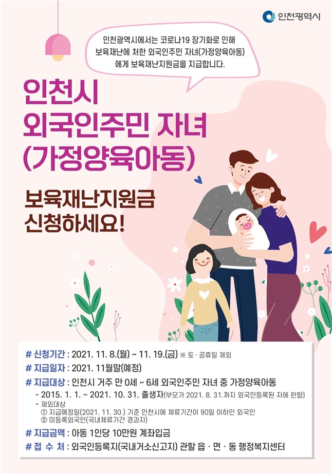 인천광역시는 관내 거주하는 외국인주민 자녀 중 가정에서 양육하는 아동에게 1인당 10만원씩 보육재난지원금을 이달 말에 지급한다고 1일 밝혔다.