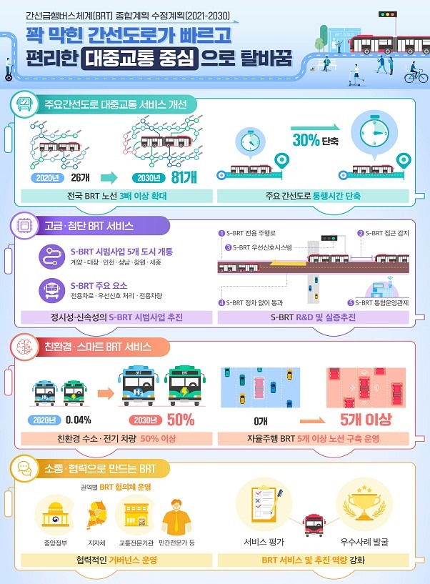 또 5개 이상 노선에서는 자율주행 차량이 운행되고 BRT 차량의 친환경차 비중은 현재 0.04%에서 2030년 50%까지 대폭 확대된다.