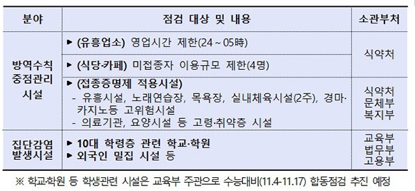 이번 점검은 행안부 등 8개 부처와 지자체가 참여, 서울·경기·인천 등 수도권을 중심으로 중점관리시설 및 최근 집단감염 발생 시설 대상 방역수칙 위반행위를 단속하면서 접종증명·음성확인제 적용에 대해 안내와 계도를 실시한다.