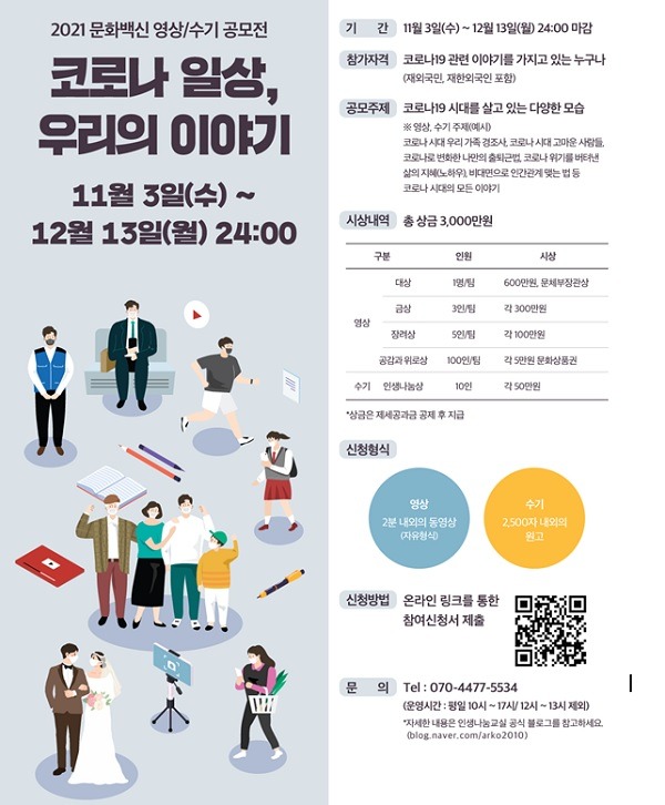 문체부 정책담당자는 “이번 ‘문화 백신 공모전’을 통해 우리 공동체 구성원들이 코로나19 시대에 겪은 각자의 경험을 공유하고, 함께 공감하고 위로하며 일상 회복을 마주할 수 있기를 바란다”고 밝혔다.