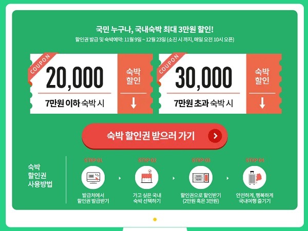 숙박비 7만 원 이하일 경우에는 2만 원 할인권, 7만 원 초과 때에는 3만 원 할인권을 사용할 수 있다. 할인이 적용되는 시설은 호텔, 콘도, 리조트, 펜션, 농어촌민박, 모텔 등 국내 숙박시설이다. 미등록 숙박시설과 대실에는 할인권을 사용할 수 없다.