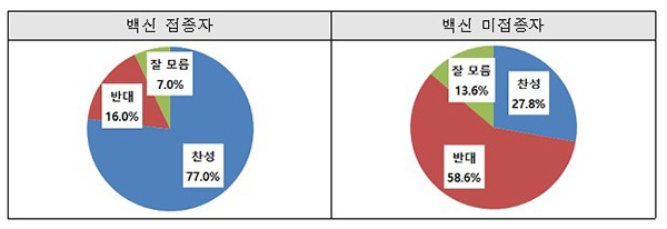 이번 설문조사 결과에 따르면 백신 접종자 중 77%가 찬성한 반면 미접종자는 27.8%만 접종증명·음성확인제(백신패스) 도입에 찬성했다.
