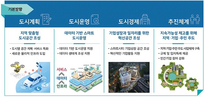 국토부는 스마트시티를 도시문제를 해결하기 위한 개별 기술과 서비스 등 솔루션뿐 아니라 도시 인프라와 공간구조, 도시계획, 도시 운영 등이 종합적으로 융합된 도시로 변화시킬 방침이다.