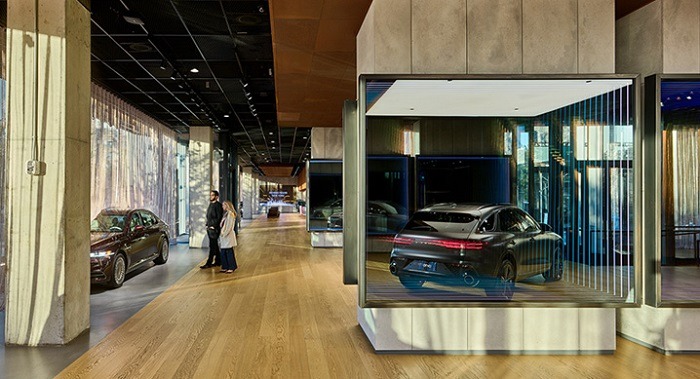 제네시스 차량을 하나의 예술품으로 감상할 수 있도록 꾸며진 인테리어는 '겉으로 드러나는 화려함이 아닌 본질에 집중하는 가치'라는 제네시스의 브랜드 정체성을 시각화한 것으로 콘크리트, 원목, 강판 등의 원재료 고유 특성이 자연스럽게 드러날 수 있도록 배치했다.