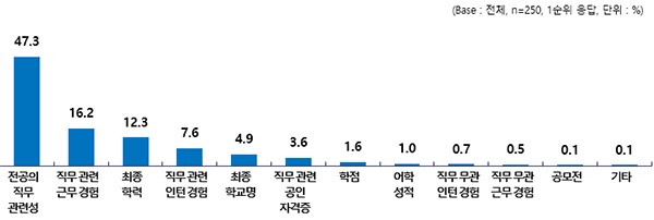 조사 결과에 따르면 신입 채용 때 가장 중요하게 고려하는 요소로, 먼저 입사지원서에서는 전공의 직무관련성이 47.3%였고 이어 직무 관련 근무 경험은 16.2%, 최종 학력 12.3% 순이었다.