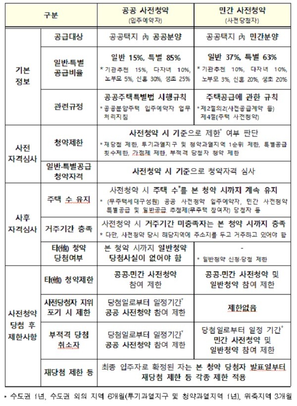 아울러, 사전당첨자로 선정된 자는 본 청약 당첨자와 동일하게 본 청약 당첨일을 기준으로 재당첨 제한, 특별공급 횟수 제한, 민영주택 가점제 적용 제한 등 청약 제한사항을 적용받는다.