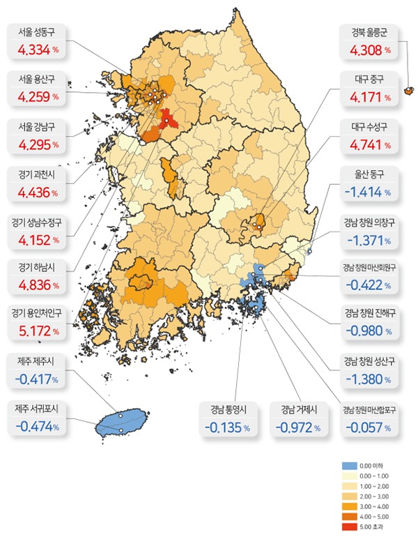 시·군·구 기초자치단체 중에서는 경기 용인 처인구(5.17%)가 최고 상승률을 기록했다. 2월 SK하이닉스 반도체 단지 지정과 용인 테크노밸리 인근 투자 수요 증대 등의 영향으로 분석된다.