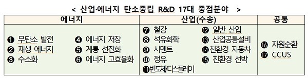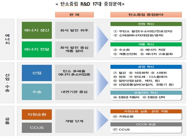 이와함께 2030년 NDC 달성 및 2050년 탄소중립 실현을 위한 17대 분야 핵심기술을 제시하고 성과 중심의 대형·통합형 R&D, 현장 중심의 실증형 R&D를 집중 지원한다.
