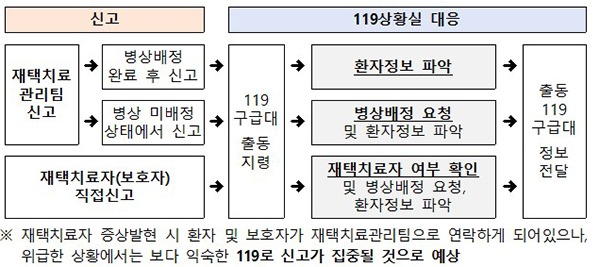 이를 위해 시·도별 119종합상황실 구급상황관리센터에서는 재택치료관리팀 또는 관리의료기관과 24시간 핫라인을 구축해 정보를 공유한다.