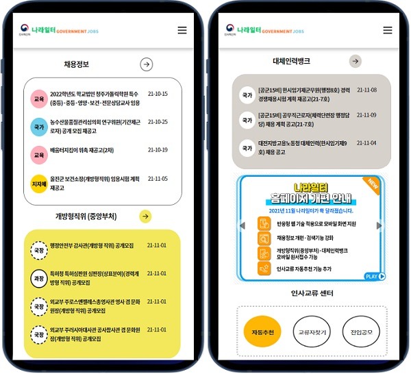 특히 모바일 화면은 기능별로 색상을 달리하고 가독성을 높이는 디자인으로 구성하는 한편, 채용 메뉴 재구성과 채용정보 읽어주기 서비스를 통해 공직 일자리 정보를 한눈에 볼 수 있도록 했다.