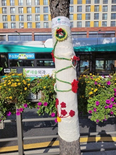 가로수정원사봉사단 단원, (재)그린트러스트 회원 등 30여 명은 17일 수원컨벤션센터 일원 가로수 50주를 따뜻한 재질의 천으로 감쌌다. 겨울옷은 가로수정원사봉사단이 디자인한 것으로 털실로 만든 꽃, 트리 등으로 장식했다.