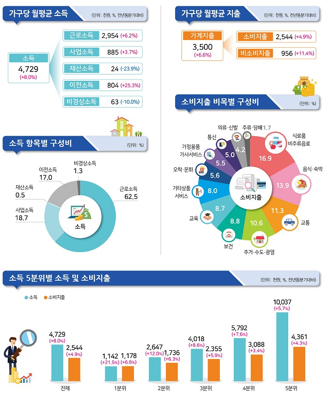 가계 흑자액(처분가능소득에서 소비지출을 뺀 금액)은 122만9000원으로 12.4% 늘었고, 흑자율(처분가능소득 대비 흑자액 비율)은 32.6%로 1.5%p 상승했다.