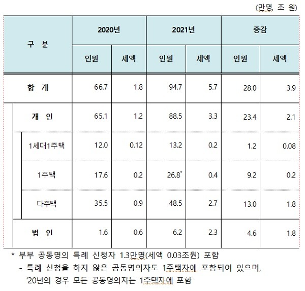 주택시장 안정을 위한 다주택자 과세강화 조치로 3주택 이상자(조정 2주택 포함)의 과세인원은 41만5000명으로 78% 늘고 세액은 2조6000억 원으로 223% 증가했다.