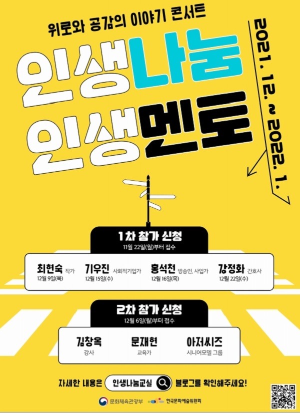 아울러 이야기 콘서트는 내년 1월부터 유튜브 채널(한국문화예술위원회, 인생나눔교실TV, 인문360 채널)을 통해 회차별 영상으로도 볼 수 있다.