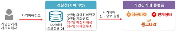 이를 위해 오는 12월 말부터 경찰청 사이버수사국 홈페이지(https://cyber.go.kr)와 사이버캅 앱 ‘사이버사기 피해신고 이력조회’ 서비스에서 사기거래에 사용된 모바일 메신저 계정·이메일 주소까지 조회할 수 있도록 순차적으로 시스템이 개선된다.