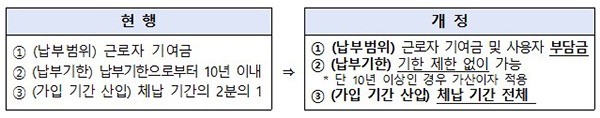 이번 개정안에서는 사업장이 연금보험료를 체납한 경우 근로자가 납부기한으로부터 10년이 지난 체납보험료라도 이자를 더해 납부하면 가입 기간을 인정받을 수 있도록 근로자의 연금수급권을 강화했다.