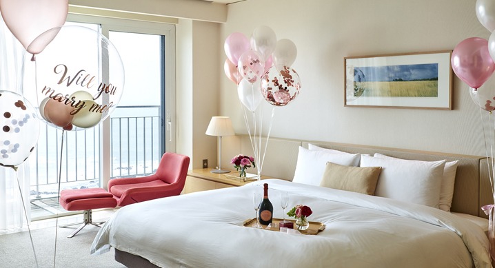 푸른 제주 바다가 한눈에 들어오는 이그제큐티브 룸 1박과 함께 연인에게 특별한 감동의 프러포즈를 전할 수 있도록 풍선 장식이 준비되며, 프렌치 파인 다이닝 레스토랑 밀리우에서 전식부터 프라임 비프, 디저트까지 포함된 ‘데귀스타시옹’ 프렌치 풀코스 메뉴가 준비되어 특별한 날을 위한 로맨틱한 저녁 시간을 보낼 수 있다.