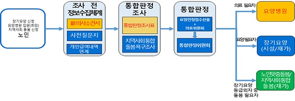 통합판정체계는 현행 장기요양 등급판정체계의 확대·개편안을 기본으로 요양병원 환자분류군, 지역사회 노인돌봄서비스의 판정·조사 기준을 융합해 개발한다.