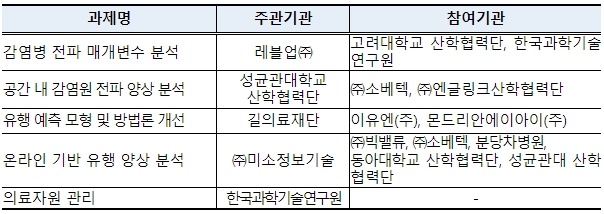 5개 과제를 중심으로 감염병 전파 매개변수, 공간별 전파 양상 등을 분석하는 해결책(솔루션)을 개발 중에 있다.