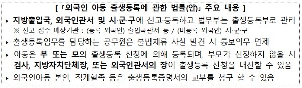 정부는 ‘외국인아동의 출생등록에 관한 법률’ 제정을 추진, 국내에서 출생한 외국인 아동에게 출생등록번호를 부여해 필요에 따라 신원확인을 위해 활용할 계획이다.